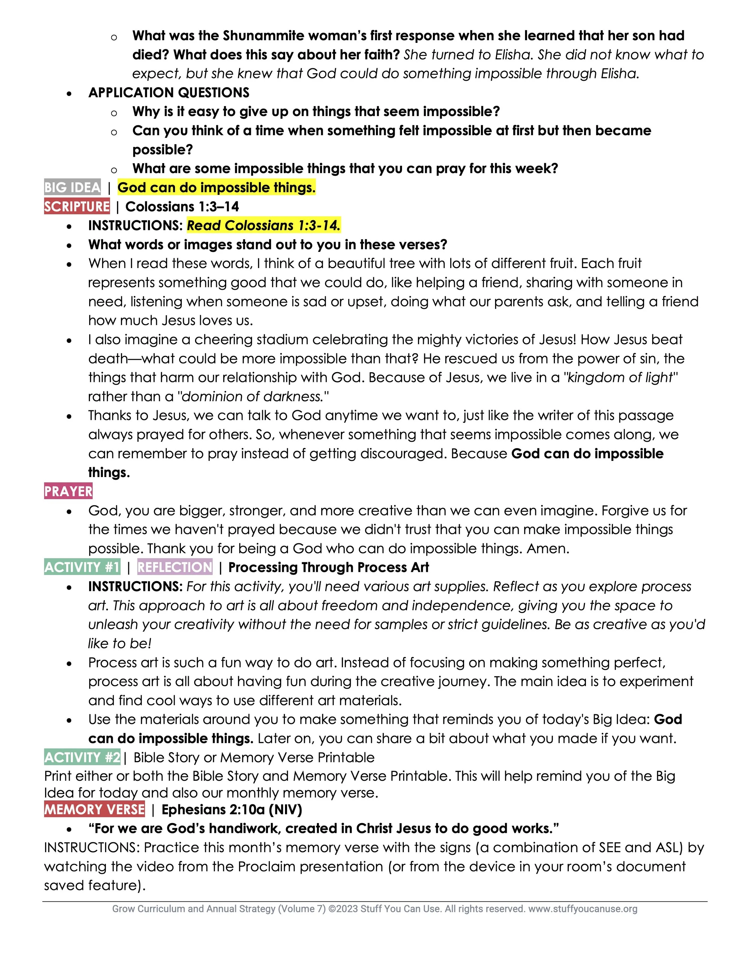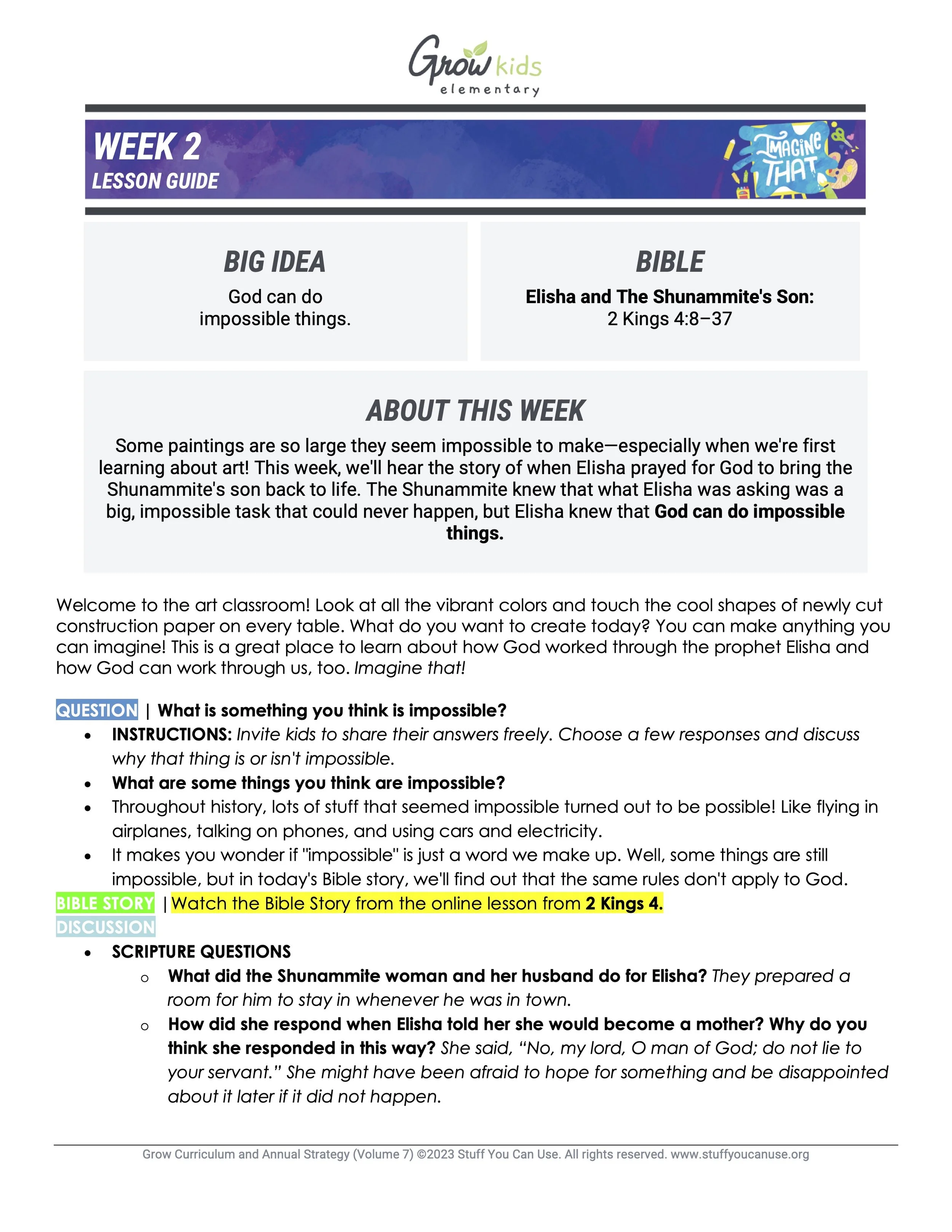 In an art class, you'll discover everything you need to know about using your imagination to create brilliant pieces of art. Sometimes, the things you create can help solve a need or show the world something amazing about who God is. In this 4-week series, kids will hear about some of the amazing things God did through Elisha to help people imagine how their gifts could make a difference. They'll see how God asks us to help each other, God can do incredible things, and how God helps us solve big problems. By the end, we'll start to see the wonderful things we can do when we know God gives us more than we can imagine.