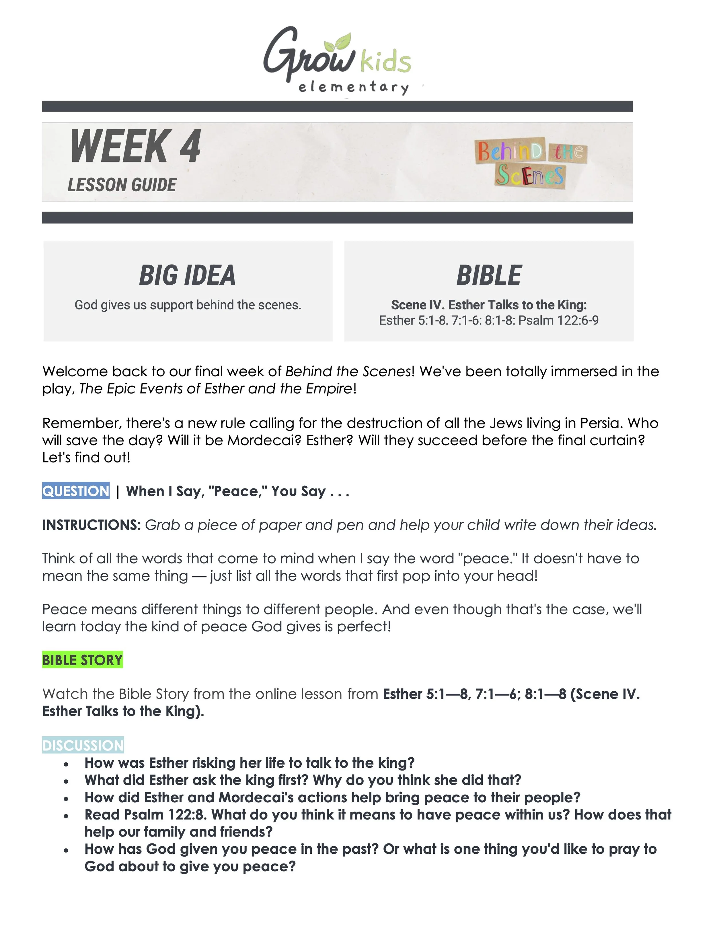 The most important part of any play is what happens “behind the scenes.” There’s lighting, wardrobe, casting, playwriting — so much has to happen perfectly to bring the production together! In the story of Esther, there is a whole lot going on behind the scenes, too. In this four-week series, kids will discover the most important character in Esther’s story isn’t always center-stage, but can often be found behind the scenes working, helping, giving support and giving peace. (Spoiler alert: It’s God!)