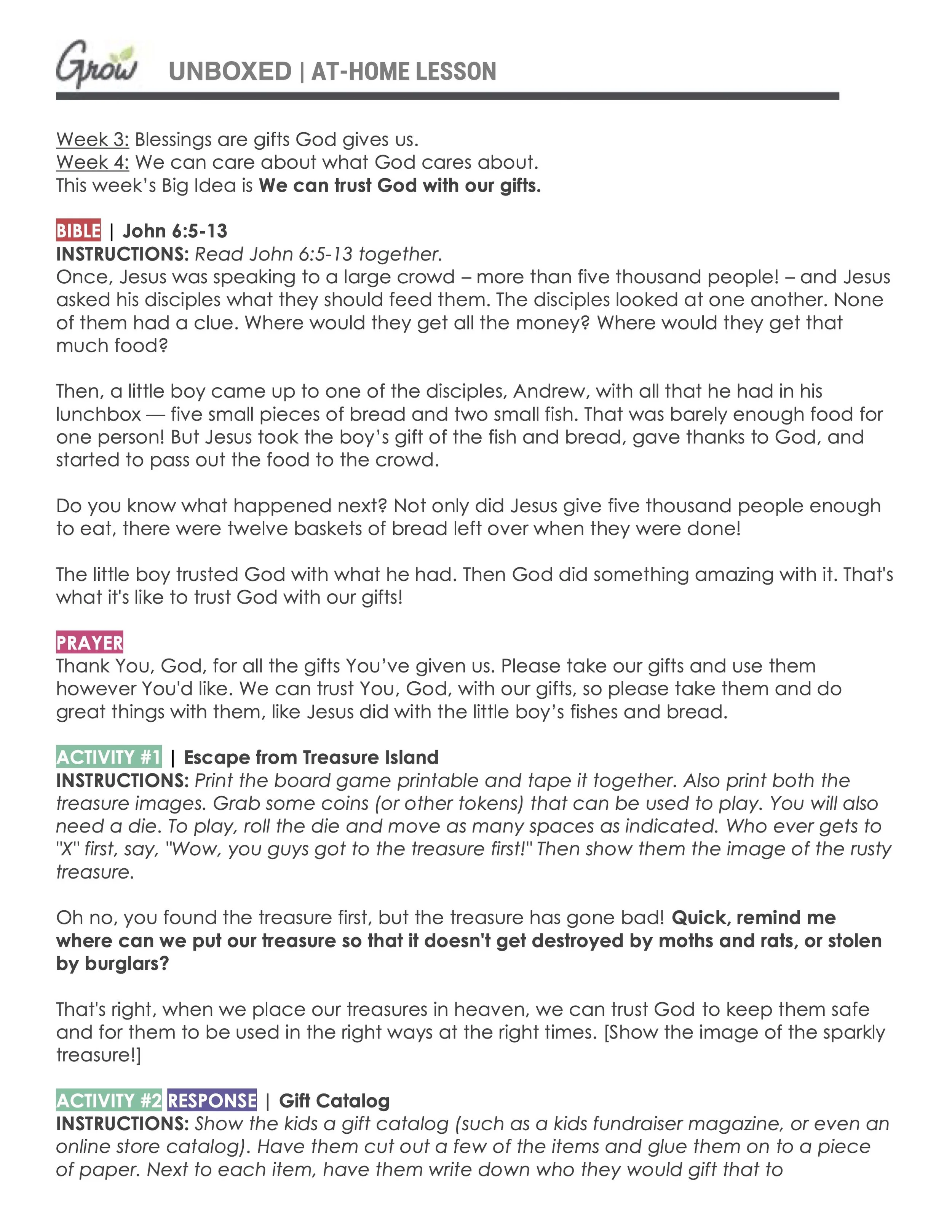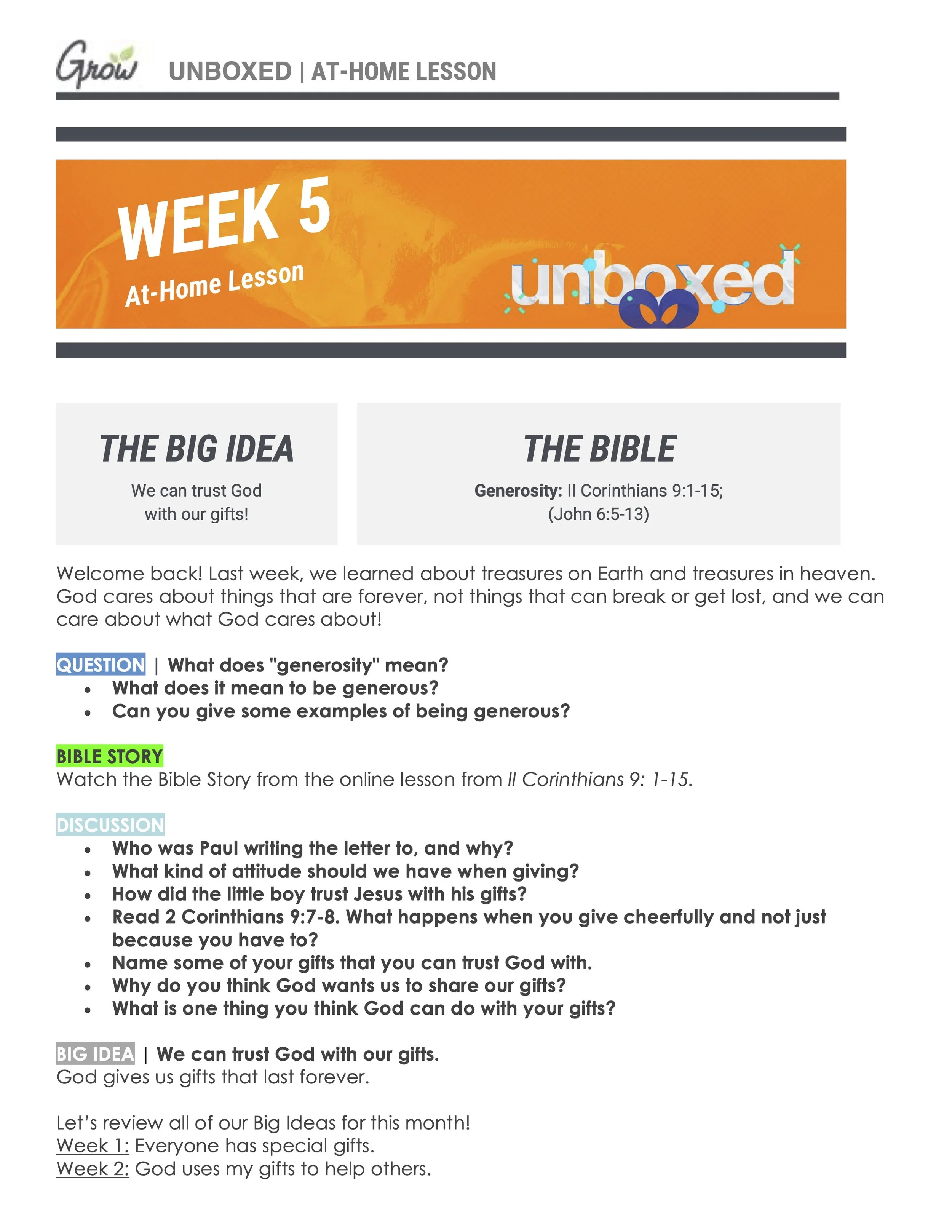 Each week we have a lesson that accompanies our videos. Below is a copy of a lesson you can do at-home to better explore the Big Idea, scripture, and monthly memory verse. You can also download the document, as a whole, below the pictures. If there are links in the lesson, they should work from the downloaded PDF.