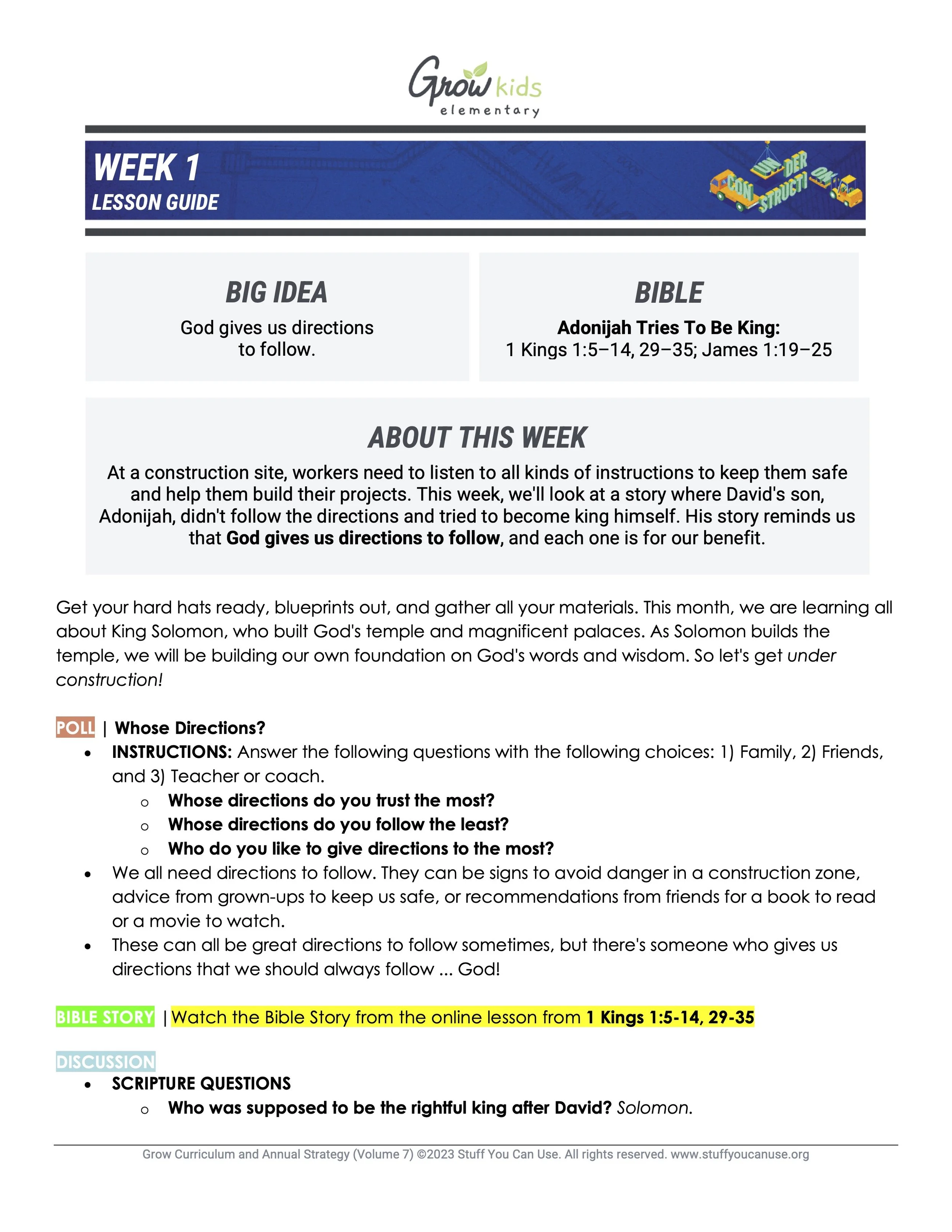 King Solomon is best known for his wisdom and for building God’s temple. Thankfully, he passed on his wisdom so others could have a strong foundation for building up their faith. In this 5-week series, kids will hear from Solomon and the wisdom he shared about the kind of life God wants to help us build. They'll see that God gives them directions to follow, listens to their requests, is worthy of their worship, gives them true wisdom, and helps them do big things!
