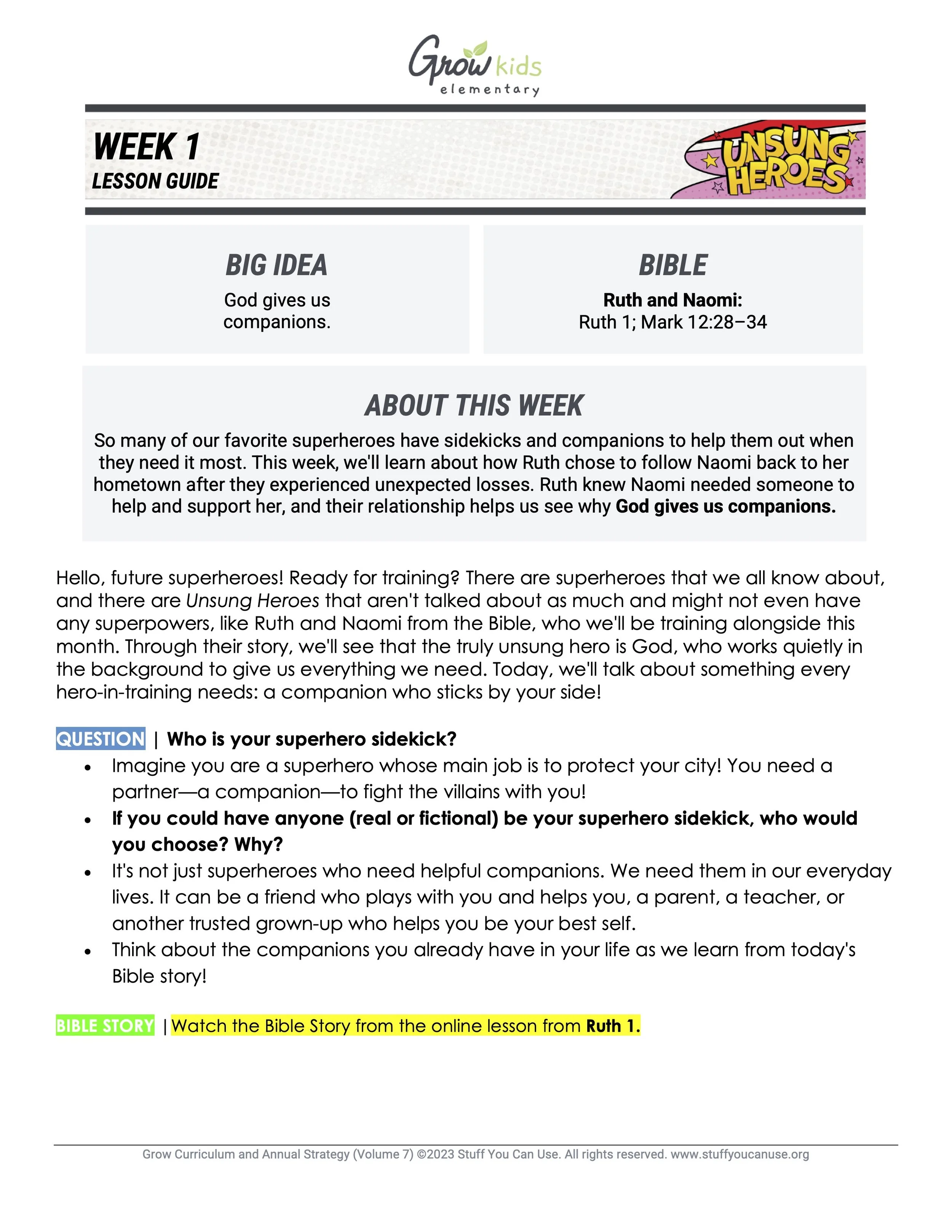 Superheroes aren't heroic only when they feel like it — they're brave each and every day. The best heroes can even inspire the people around them to be brave, faithful, and hopeful in their own lives, too. In this 4-week series, kids will learn more about what it looks like to see God as the hero of our story as they hear the story of Ruth and Naomi. They'll see how God gives them companions, opportunities, boldness, and hope so they can be heroes, too!