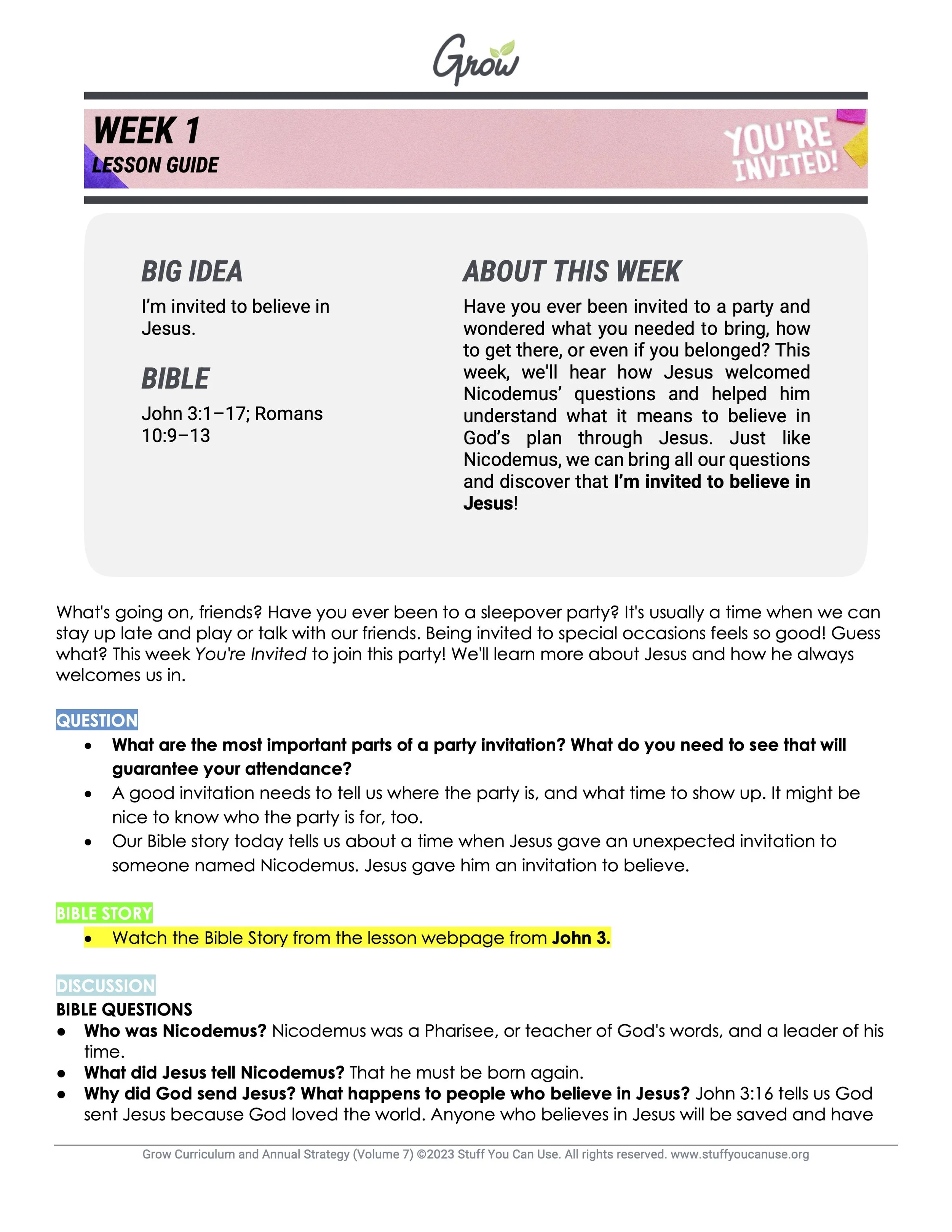 Getting invited to a party is one of the best feelings, and being left out is one of the worst. But there's good news— Jesus never leaves anyone out! He invites everyone to spend time with him, experience his love, and share it with others. This series will remind kids that Jesus' invitation is always open, and we're never too far away to join the party! In this 5-week series, kids will learn that I'm invited to believe in Jesus, love like Jesus does, experience Jesus' miracles, ask Jesus for help, and worship Jesus.