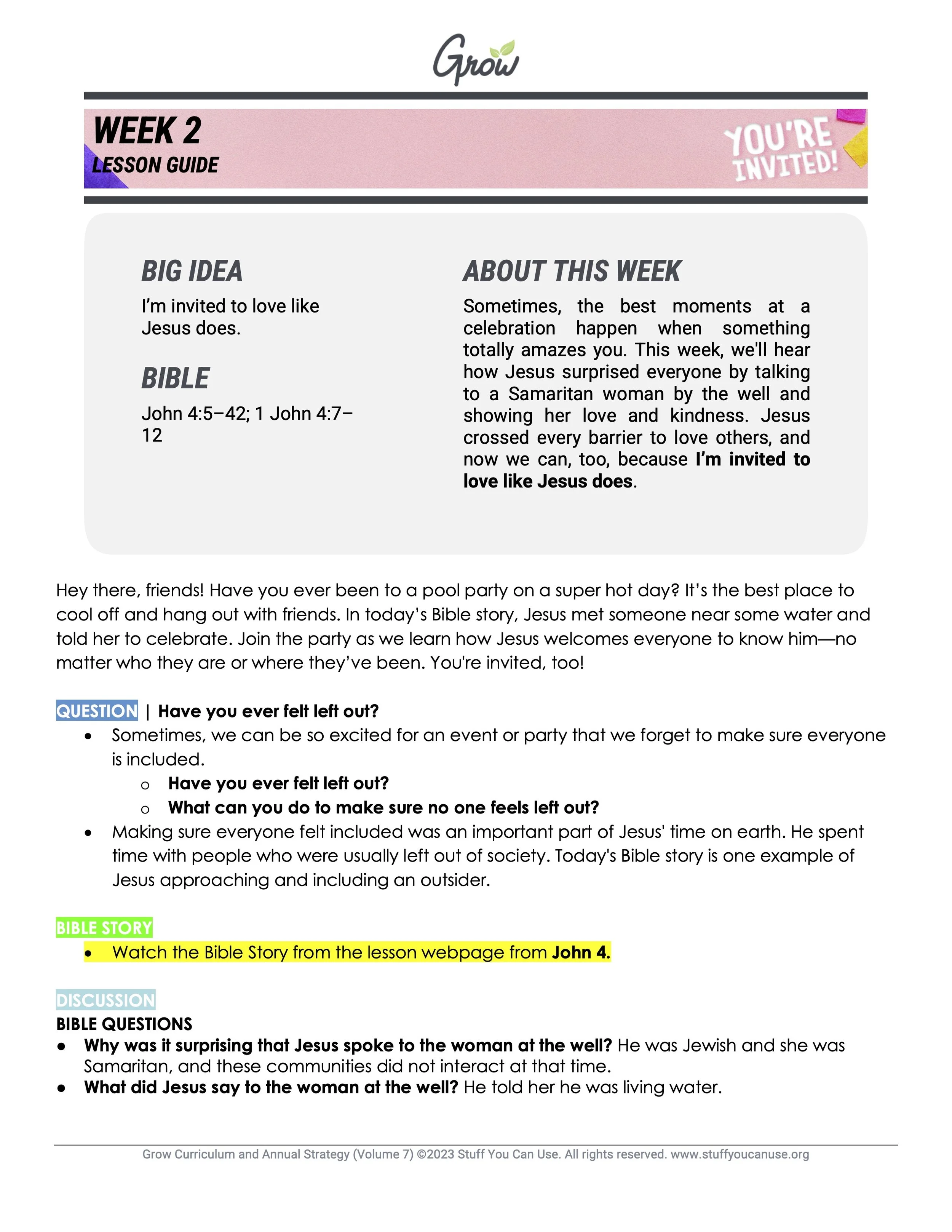 Getting invited to a party is one of the best feelings, and being left out is one of the worst. But there's good news— Jesus never leaves anyone out! He invites everyone to spend time with him, experience his love, and share it with others. This series will remind kids that Jesus' invitation is always open, and we're never too far away to join the party! In this 5-week series, kids will learn that I'm invited to believe in Jesus, love like Jesus does, experience Jesus' miracles, ask Jesus for help, and worship Jesus.