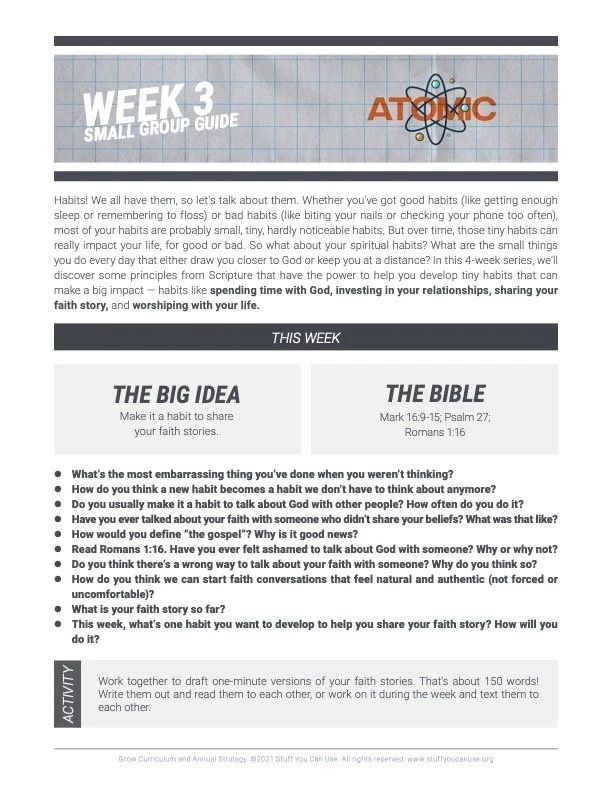 Habits! We all have them, so let’s talk about them. Whether you’ve got good habits (like getting enough sleep or remembering to floss) or bad habits (like biting your nails or checking your phone too often), most of your habits are probably small, tiny, hardly noticeable habits. But over time, those tiny habits can really impact your life, for good or bad. So what about your spiritual habits? What are the small things you do every day that either draw you closer to God or keep you at a distance? In this 4-week series, we’ll discover some principles from Scripture that have the power to help you develop tiny habits that can make a big impact — habits like spending time with God, investing in your relationships, sharing your faith story, and worshiping with your life.