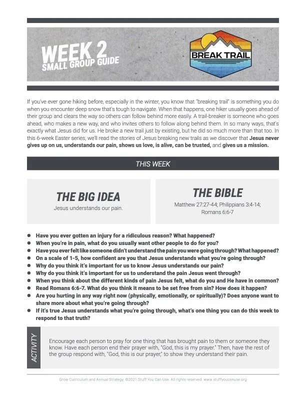 If you’ve ever gone hiking before, especially in the winter, you know that “breaking trail” is something you do when you encounter deep snow that’s tough to navigate. When that happens, one hiker usually goes ahead of their group and clears the way so others can follow behind more easily. A trail-breaker is someone who goes ahead, who makes a new way, and who invites others to follow along behind them. In so many ways, that’s exactly what Jesus did for us. He broke a new trail just by existing, but he did so much more than that too. In this 6-week Easter series, we’ll read the stories of Jesus breaking new trails as we discover that Jesus never gives up on us, understands our pain, shows us love, is alive, can be trusted, andgives us a mission.