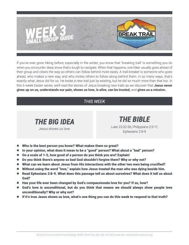 If you’ve ever gone hiking before, especially in the winter, you know that “breaking trail” is something you do when you encounter deep snow that’s tough to navigate. When that happens, one hiker usually goes ahead of their group and clears the way so others can follow behind more easily. A trail-breaker is someone who goes ahead, who makes a new way, and who invites others to follow along behind them. In so many ways, that’s exactly what Jesus did for us. He broke a new trail just by existing, but he did so much more than that too. In this 6-week Easter series, we’ll read the stories of Jesus breaking new trails as we discover that Jesus never gives up on us, understands our pain, shows us love, is alive, can be trusted, andgives us a mission.