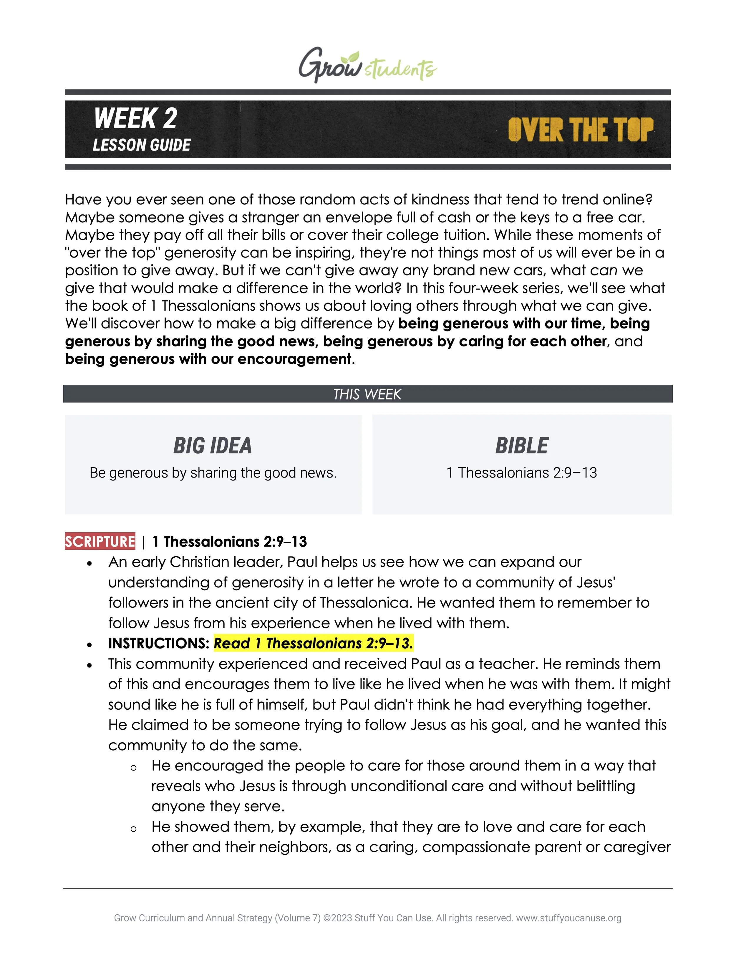 Have you ever seen one of those random acts of kindness that tend to trend online? Maybe someone gives a stranger an envelope full of cash or the keys to a free car. Maybe they pay off all their bills or cover their college tuition. While these moments of "over the top" generosity can be inspiring, they're not things most of us will ever be in a position to give away. But if we can't give away any brand new cars, what can we give that would make a difference in the world? In this four-week series, we'll see what the book of 1 Thessalonians shows us about loving others through what we can give. We'll discover how to make a big difference by being generous with our time, being generous by sharing the good news, being generous by caring for each other, and being generous with our encouragement.