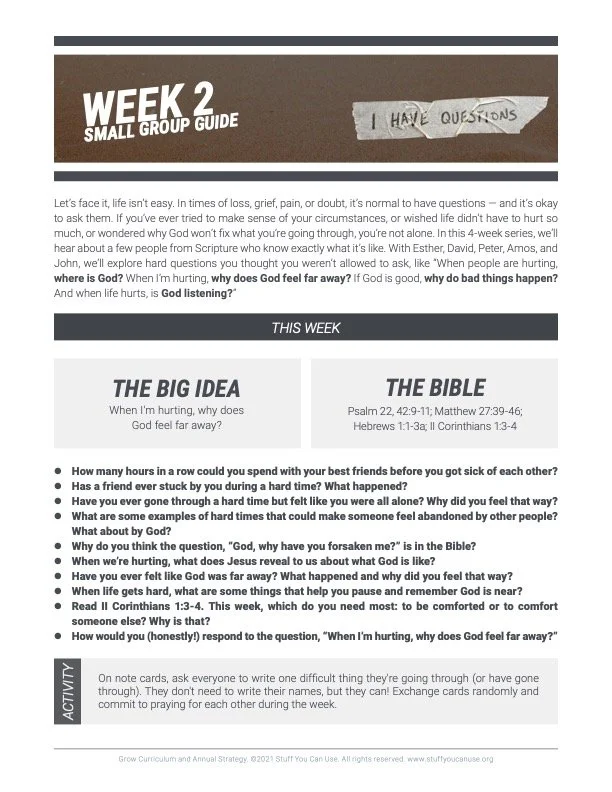 Let’s face it, life isn’t easy. In times of loss, grief, pain, or doubt, it’s normal to have questions — and it’s okay to ask them. If you’ve ever tried to make sense of your circumstances, or wished life didn’t have to hurt so much, or wondered why God won’t fix what you’re going through, you’re not alone. In this 4-week series, we’ll hear about a few people from Scripture who know exactly what it’s like. With Esther, David, Peter, Amos, and John, we’ll explore hard questions you thought you weren’t allowed to ask, like “When people are hurting, where is God? When I’m hurting, does God leave me? If God is good, why do bad things happen? And when life hurts, is God listening?“