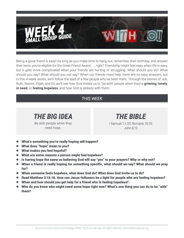 Being a good friend is easy! As long as you make time to hang out, remember their birthday, and answer their texts, you’re eligible for the Great Friend Award . . . right? Friendship might feel easy when life is easy, but it gets more complicated when your friends are hurting or struggling. What should you do? What should you say? What should you not say? When our friends need help, there are no easy answers, but in this 4-week series, we’ll follow the lead of a few people who’ve been there. Through the stories of Job, Ruth, Naomi, Elijah, and Eli, we’ll see how God invites us to “be with” people when they’re grieving, lonely, in need, or feeling hopeless, and how God is already with them.